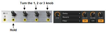 While holding down the FX MIX button, turn the 1, 2, or 3 knob to assign an effect to the first, second, or third effects bank.